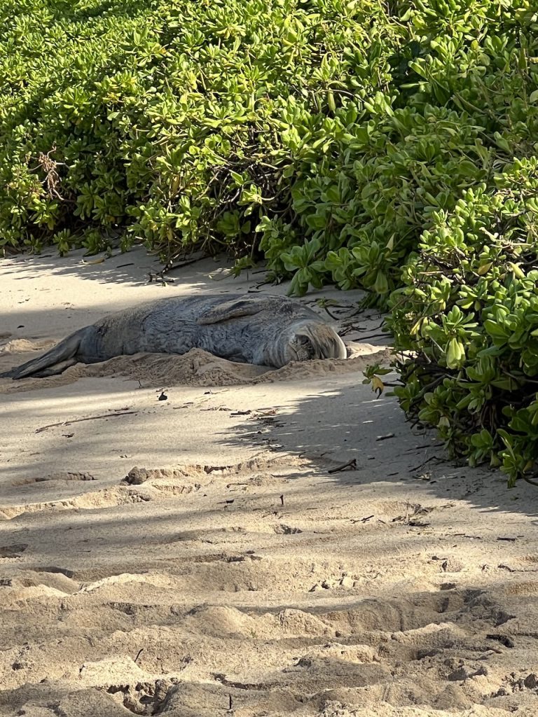Every morning, like clockwork, we get up and walk down the beach front path, past Disney’s Aulani resort to the Four Seasons where the path appears to end with a circular spot in the path, but it doesn’t. The path continues until it narrows amongst the lush landscaping in front of the Four Seasons. At the end of the narrow path, you transition through the green hedges to the rocky beachfront for your final approach to Secret Beach to see if any monks are resting on the sand.