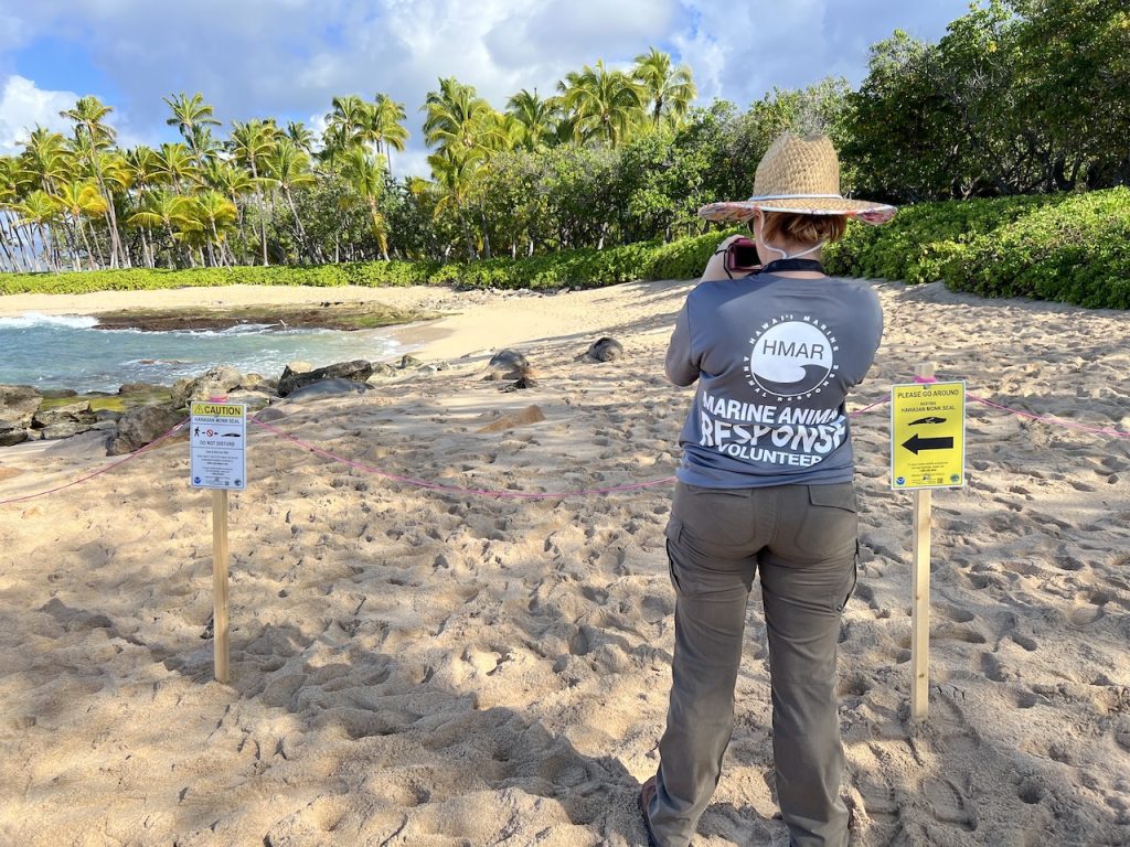 We would then call in the sighting to the Hawaii Marine Animal Response (HMAR) or National Oceanic and Atmospheric Administration (NOAA) and let them know we had spotted a monk on shore. They usually asked us to wait there until a volunteer could show up with signs encouraging spectators to keep a safe distance away.