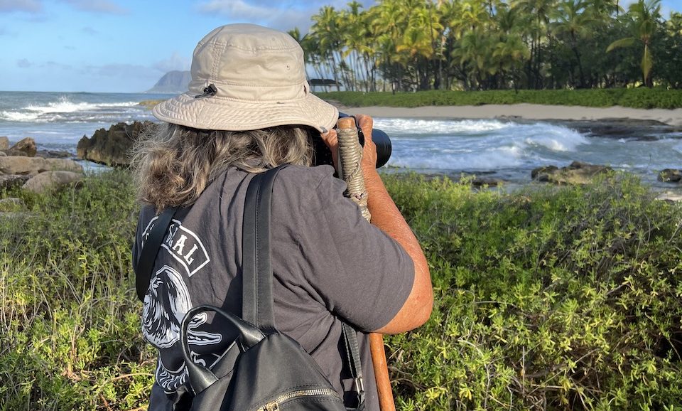 That is how we met Barbara. Barbara and her husband had been NOAA volunteers for 17 years and now monitor the west side of Oahu beaches, unofficially. She is well known and respected among the monk seal community. You can spot her right away with her sun hat, walking stick, huge camera, and “Monk Mom” t-shirt. Yes, her husband has a “Monk Dad” shirt too! After seeing her for several years in a row, we eventually started saying hello each time we saw her. I’m not sure she remembers us from year to year, but we always look forward to seeing if she’s still around.